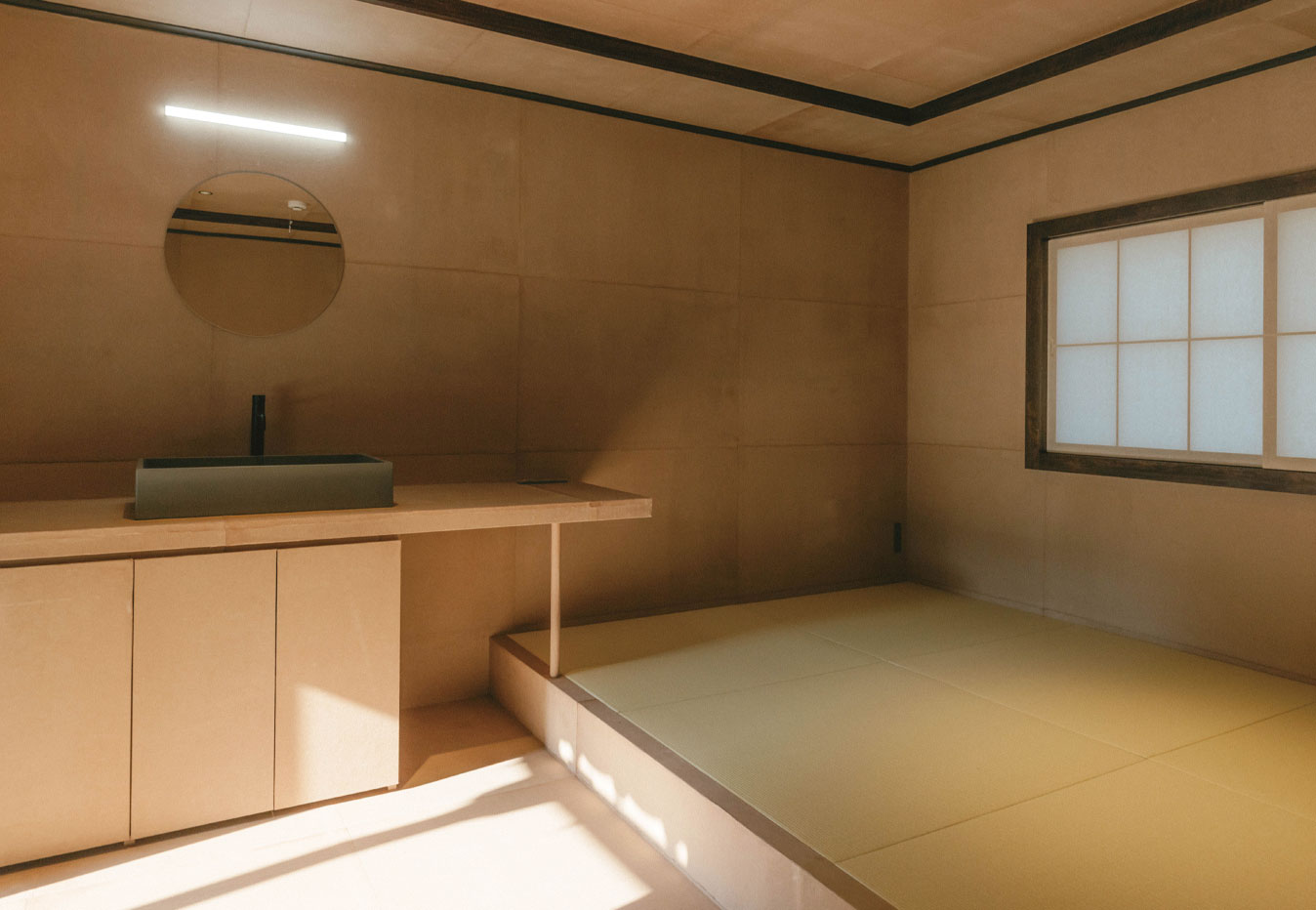 和紙職人・ハタノワタルさんによって施工されたこの部屋は、天井から床まで、すべてが和紙で仕立てられています。地元の柿渋でやさしく染め上げられた壁は、光や時間とともに色を深め、心を落ち着かせてくれます。自然素材に包まれた空間は、まるで森の中にいるような静けさ。